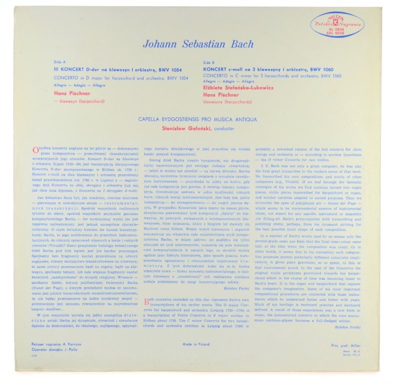 Bach - Elżbieta Stefańska-Łukowicz, Hans Pischner, Capella Bydgostiensis Pro Musica Antiqua, Stanisław Gałoński – Harpsichord Concertos BWV 1054, 1060