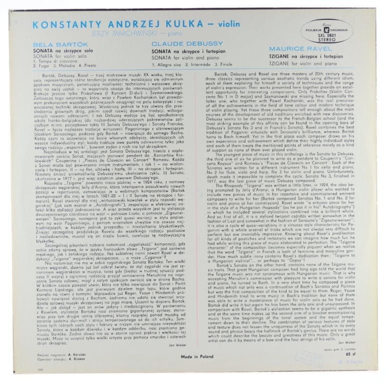 Bartók, Debussy, Ravel, Konstanty Andrzej Kulka, Jerzy Marchwiński – Sonata For Violin Solo / Sonata For Violin And Piano / Tzigane For Violin And Piano