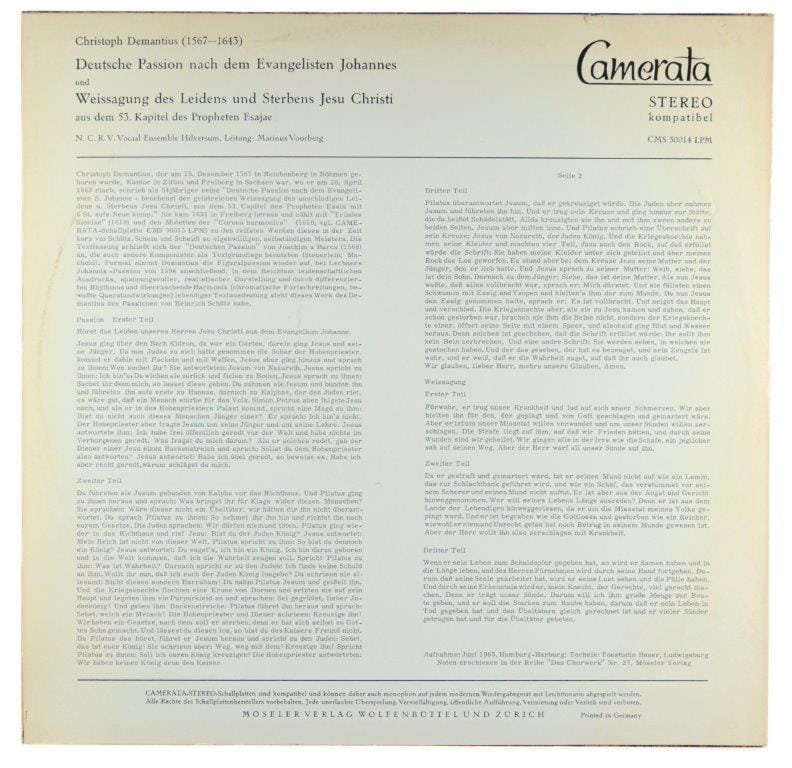 Christopher Demantius - N.C.R.V. Vocaal Ensemble Hilversum, Marinus Voorberg - Johannes Passion Und Weissagung Des Leidens Und Sterbens Jesu Christi
