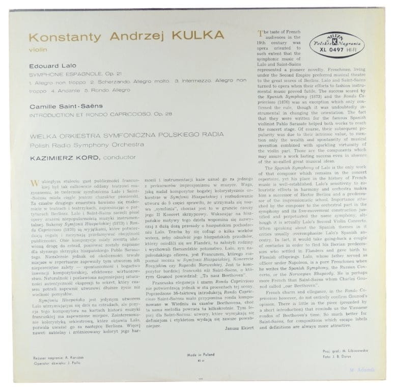 Lalo, Saint-Saëns, Konstanty Andrzej Kulka, Polish Radio Symphony Orchestra, Kazimierz Kord – Symphonie Espagnole Op. 21 / Introduction Et Rondo Capriccioso Op. 28